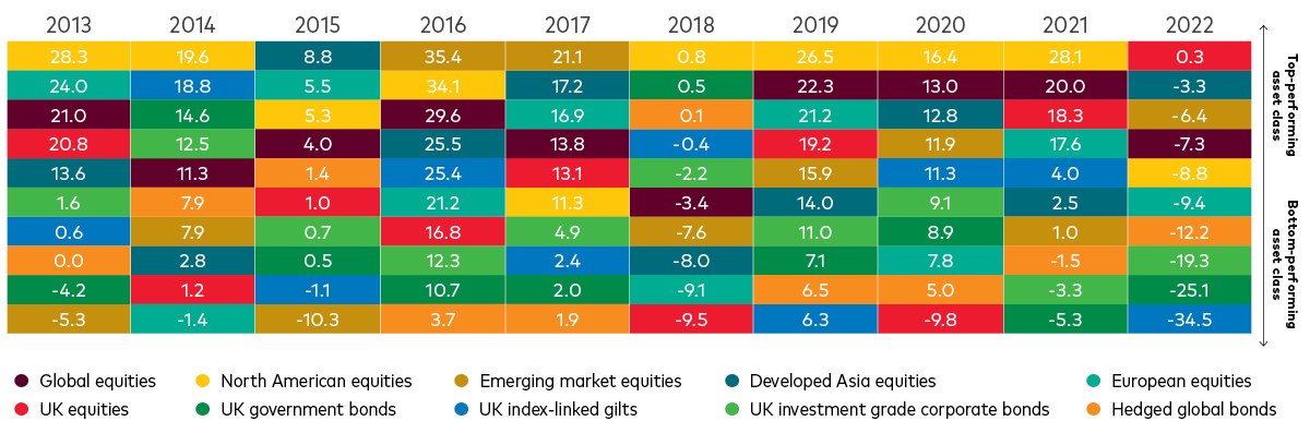 As the data below highlight, it's difficult to say exactly which sub-asset class across equity and bond markets will perform well from year to year. We only need to look at the results of 2022 to consider the dangers of concentrating investments in one region or sector, with UK equities the only asset class to deliver a positive return last year (in GBP terms).
