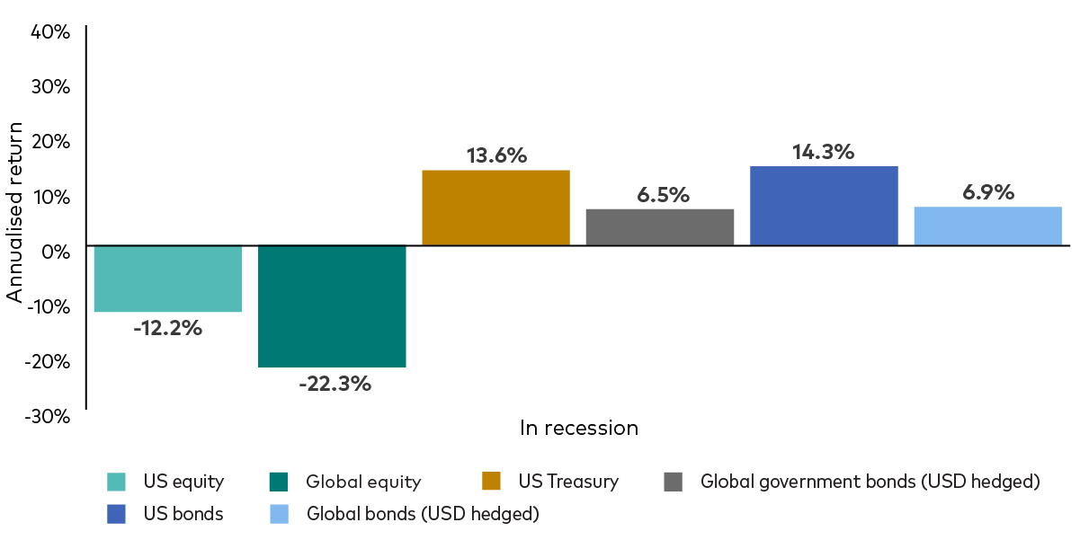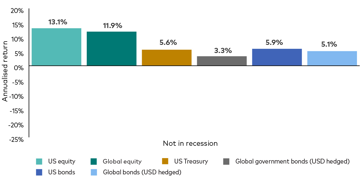 The chart below is based on US data, but the findings are relevant across global markets—that stock markets tend to drive market returns when the economy is expanding. Global equities posted an annualised return of almost 12% (in US dollar terms) in non-recessionary environments between January 1988 and the end of December 2022, with global bonds returning an average of 5.1% in those periods.